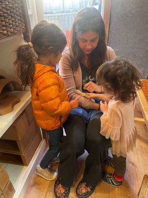 After the morning circle, the younger group will sit down for a morning snack that is provided and prepared by one of the parents. Snack always consist of an organic fruit or vegetable, a starch and a protein. Once it's announced that snack is served, hands are thoroughly washed, the children sit down with a parent, while the older group stays for an extended circle time with the Director and lead teacher, then joins for snack.